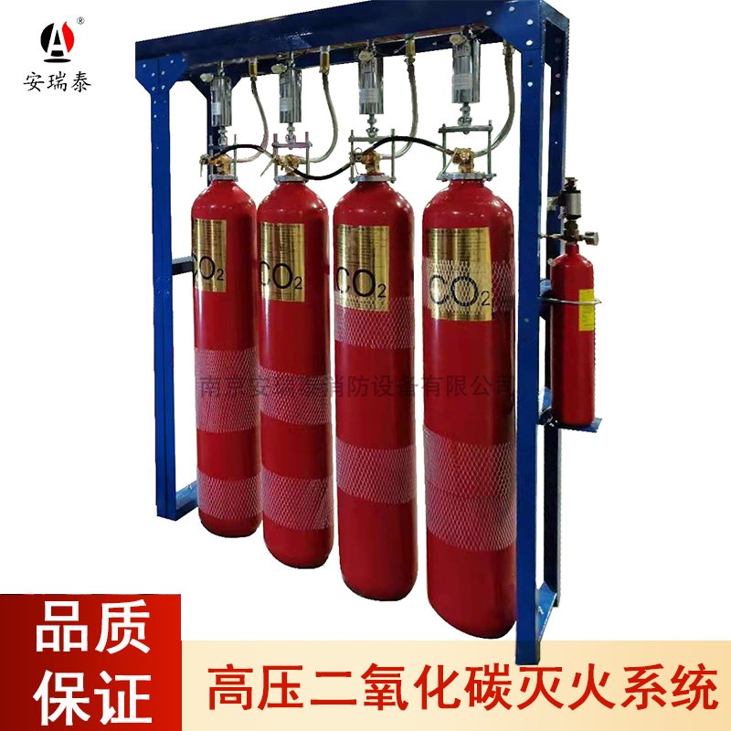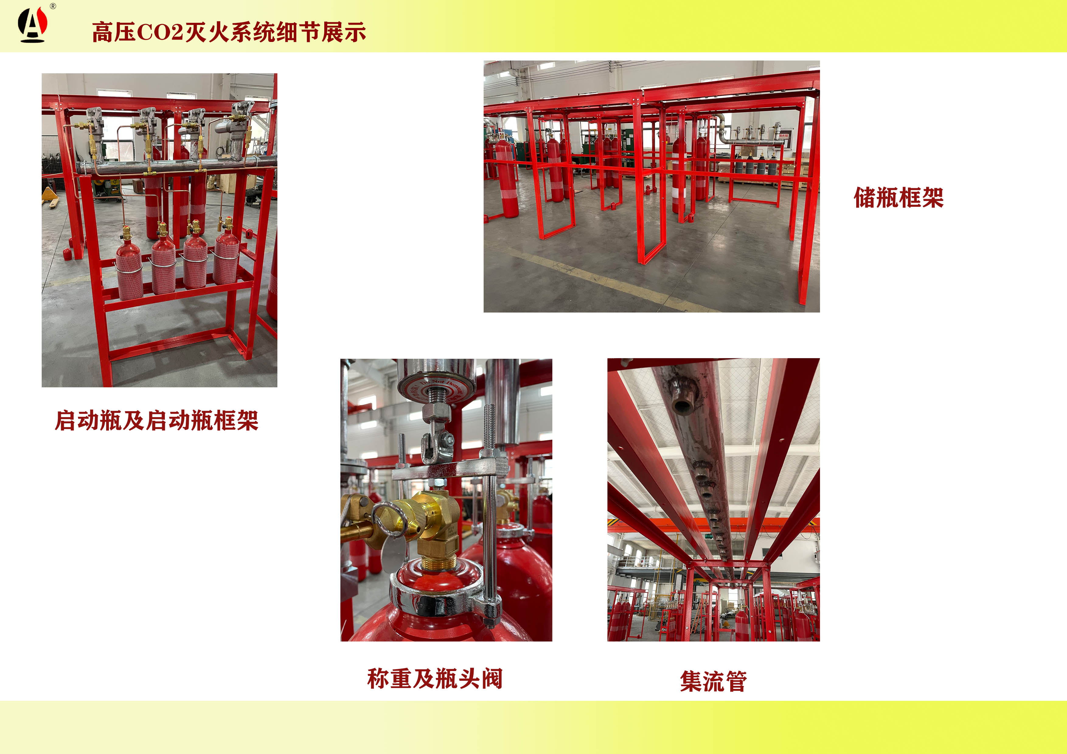 二氧化碳滅火系統(tǒng)由滅火劑儲存瓶組、稱重裝置、液體單向閥、連接管、集流管、安全閥、壓力信號器、驅(qū)動氣體儲存瓶組、氣體單向閥、選擇閥、管網(wǎng)、噴頭及自動滅火控制器等部件組成。